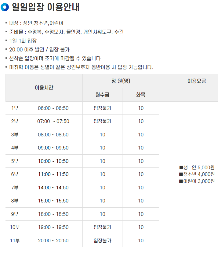 일일권 [평일] 성인 5,000원 / 청소년 4,000원 / 어린이 3,000원