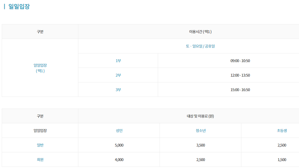 일일권 [주말, 공휴일] 비회원 성인 5,000원 / 청소년 3,500원 / 초등생 2,500원