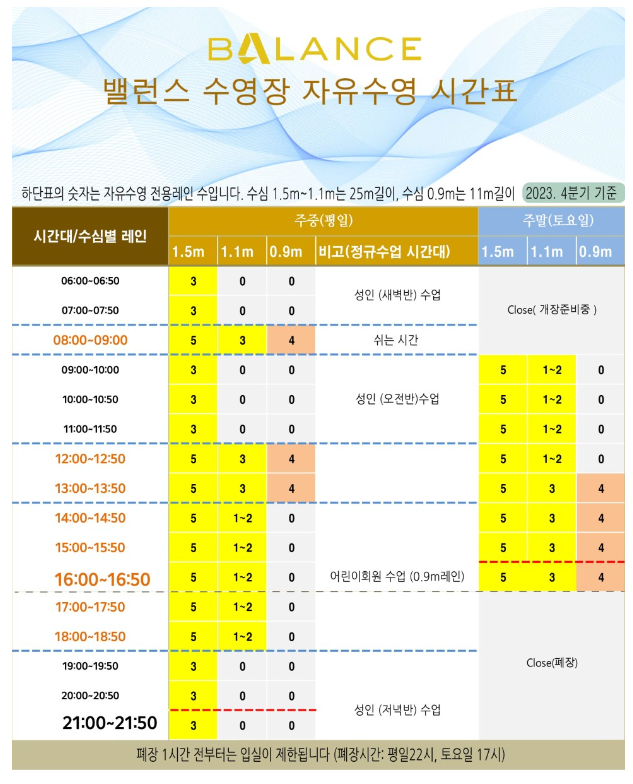 자유수영 시간 안내 (노란색 표시된 시간 모두 자유수영 가능)