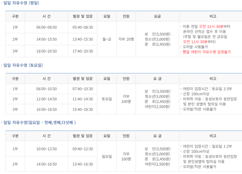 자유수영 정보는 수위미에서 확인가능합니다.