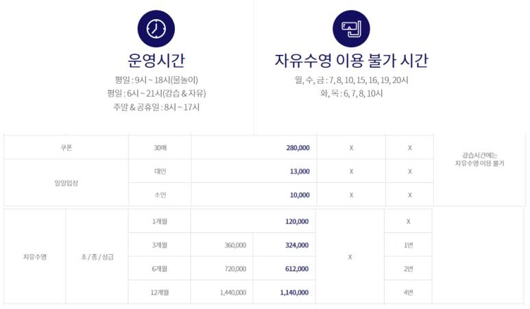 월 정기권 [월~일,공휴일] 1개월 120,000원 / 3개월 324,000원 / 6개월 612,000원 / 12개월 1,140,000원