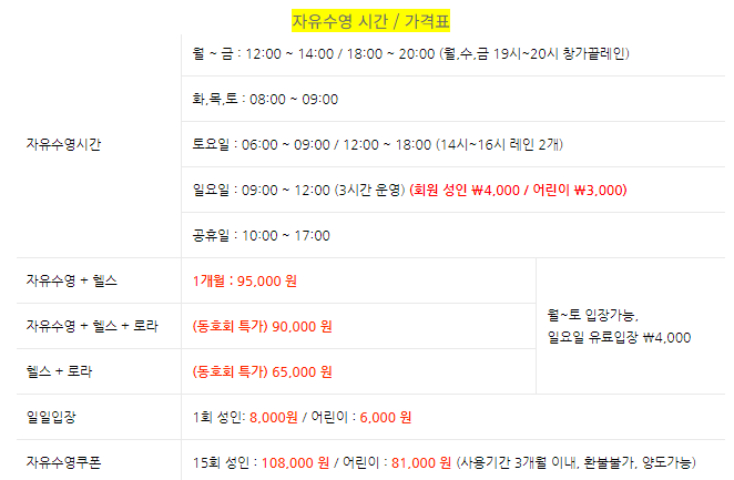 일일권 [일요일] 성인 회원 4,000원 / 어린이 3,000원