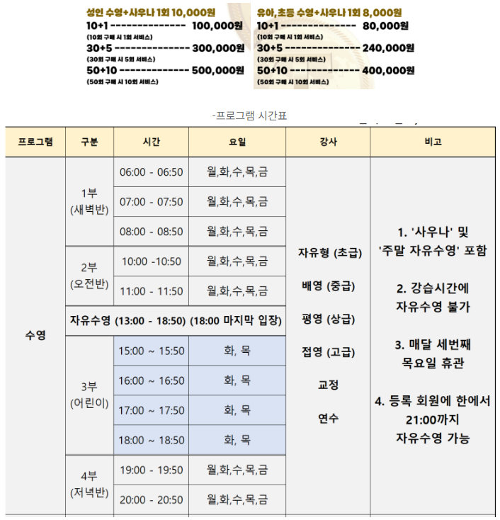 -자유수영 가격표