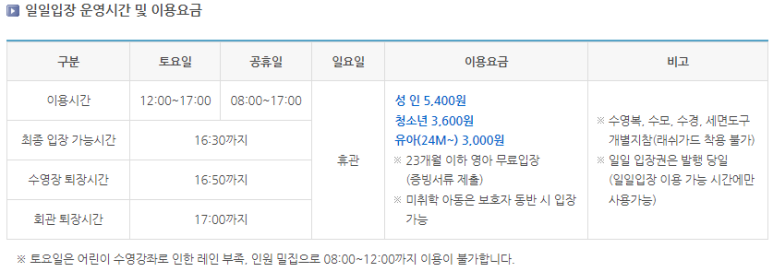 일일권 [토요일, 공휴일] 성인 5,400원 / 청소년 3,600원 / 유아 3,000원
