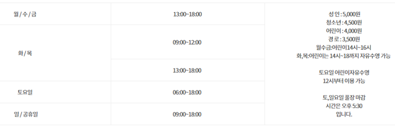 일일권 [월~일, 공휴일] 성인 5,000원 / 청소년 4,500원 / 어린이 4,000원 / 경로 3,5000원