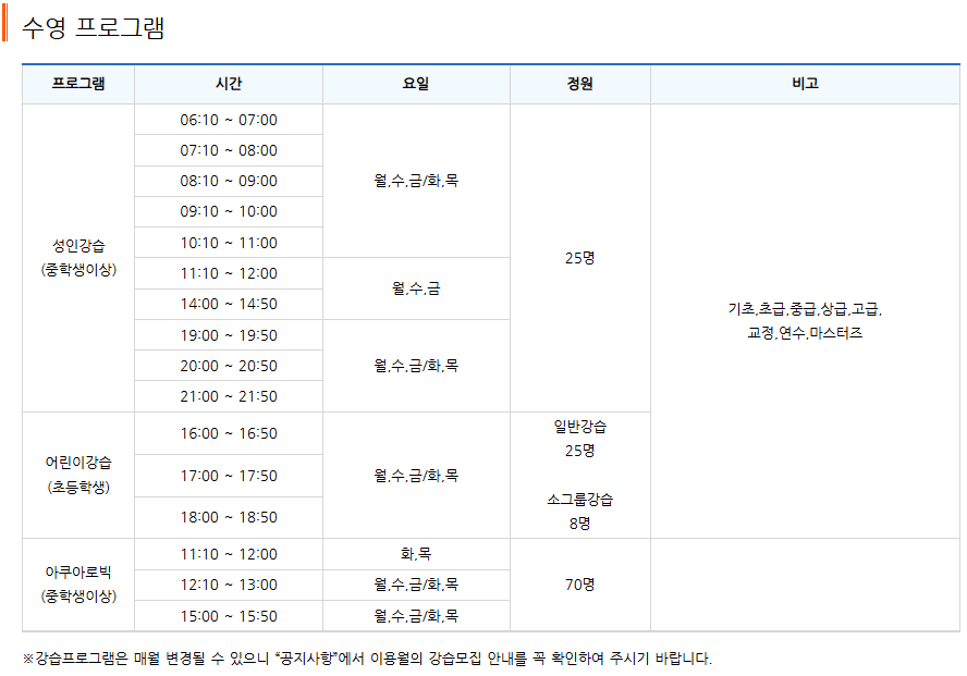 - 강습등록인원 유무에 따라 폐강 및 합반될 수 있습니다.