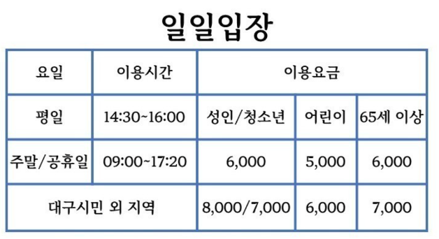 일일권 [월~일, 공휴일] 대구시민 성인,청소년 6,000원 / 어린이 5,000원 / 경로 6,000원