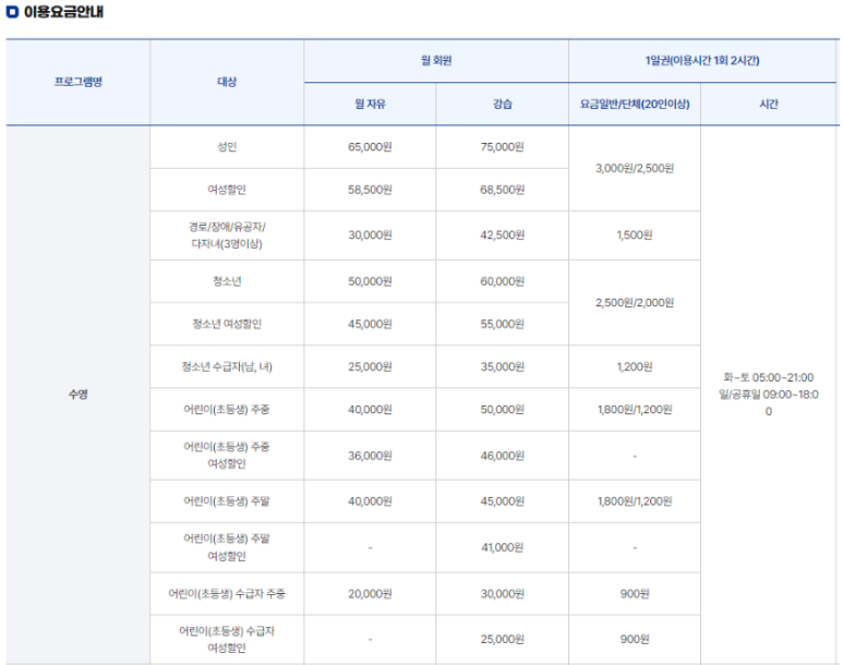 | 강원특별자치도 춘천시 신우수영장 자유수영 시간 이용료 (0) | 2025.07.22 |