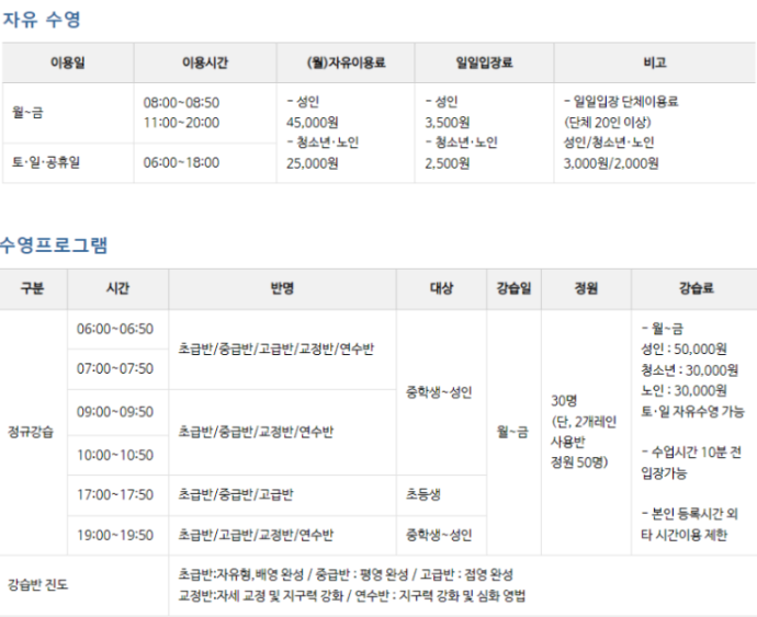 강습 : 매월 1일~ 말일(월~금) / 토·일요일 자유수영 가능